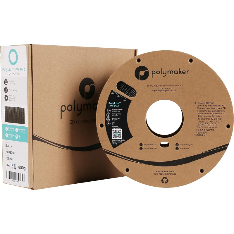 The PolyLite™ LW-PLA Black from Polymaker is a specially expanded PLA designed to be printed with similar settings to regular PLA but at half the weight and lower density.
