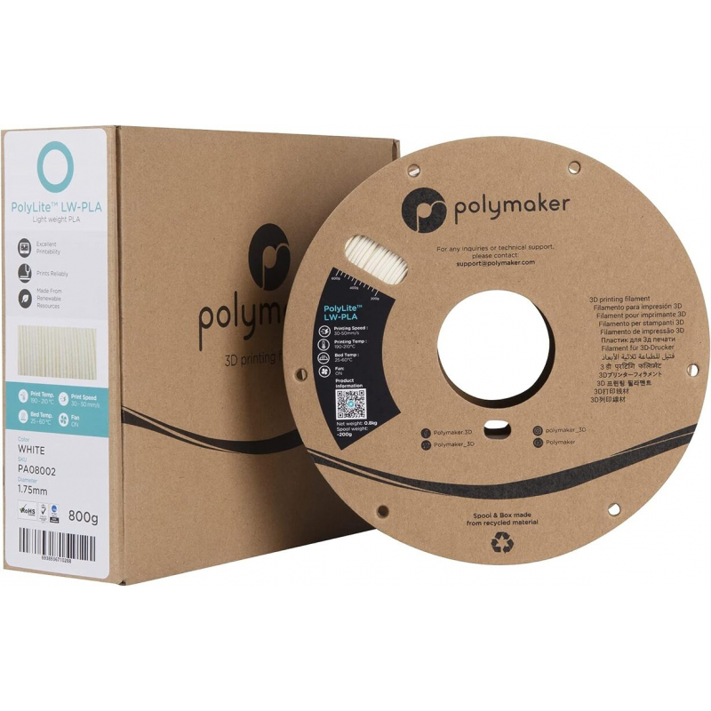 The PolyLite™ LW-PLA White from Polymaker is a specially expanded PLA designed to be printed with similar settings to regular PLA but at half the weight and lower density.