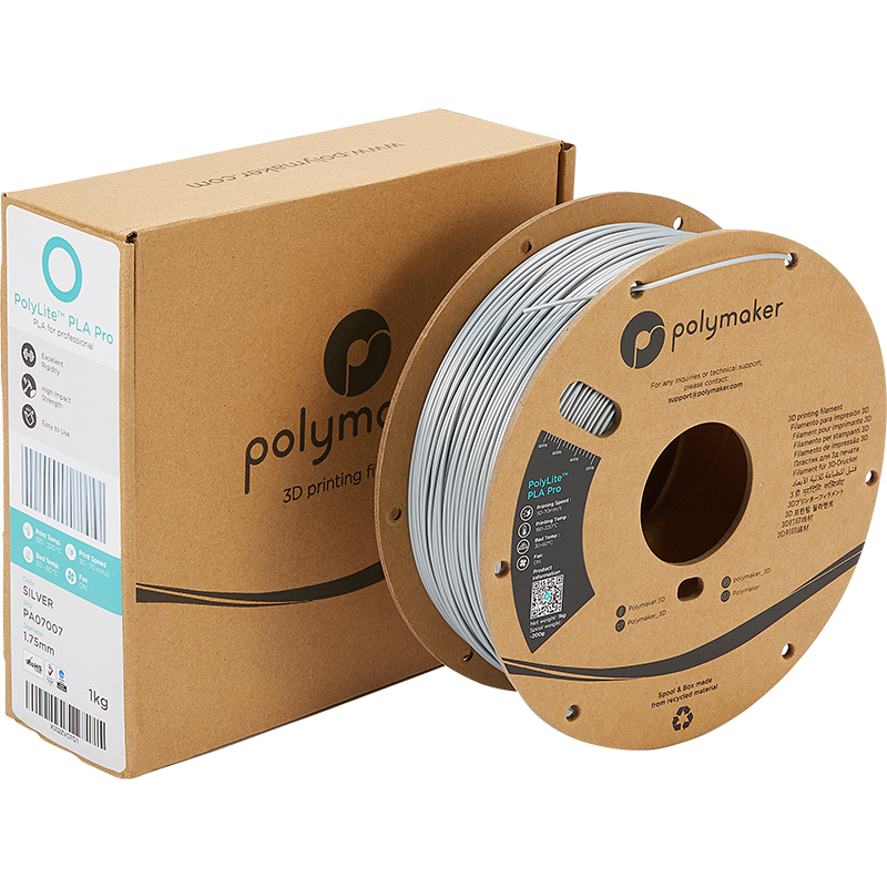 The PolyLite™ PLA Pro filament is a material that sits between two existing ranges of PLA from Polymaker. The PolyLite PLA Pro Silver provides high impact resistance while combining the excellent rigidity of PLA and other properties of standard PLA.