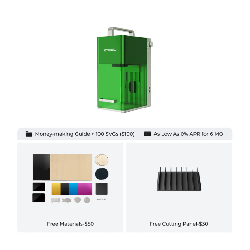 Introducing a complete engraving kit that combines four advanced devices: the xTool F1-Mint Green, the RA2 Pro rotary accessory, the xTool Desktop Smoke Purifier and the xTool Slide Extension mobile base. The kit is the ideal solution for those looking for precision, versatility and cleanliness in their creative engraving work.