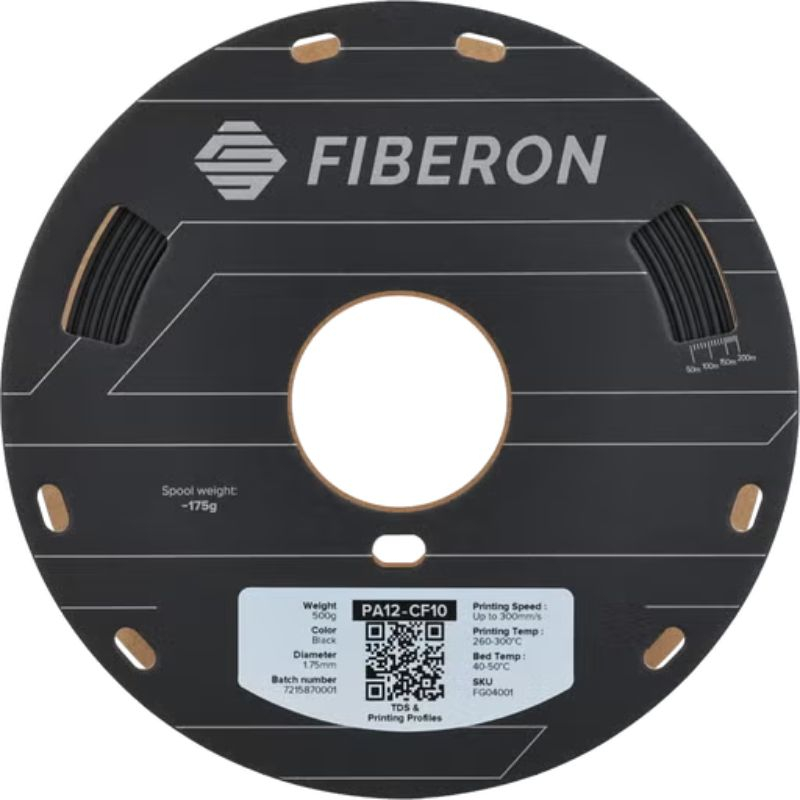 The Polymaker Fiberon™ PA12-CF10 filament is an ultra-strong material (nylon 12) reinforced with carbon fibers, designed for the most demanding technical applications. Ideal for structural and mechanical parts, it offers excellent dimensional stability and optimal mechanical performance.