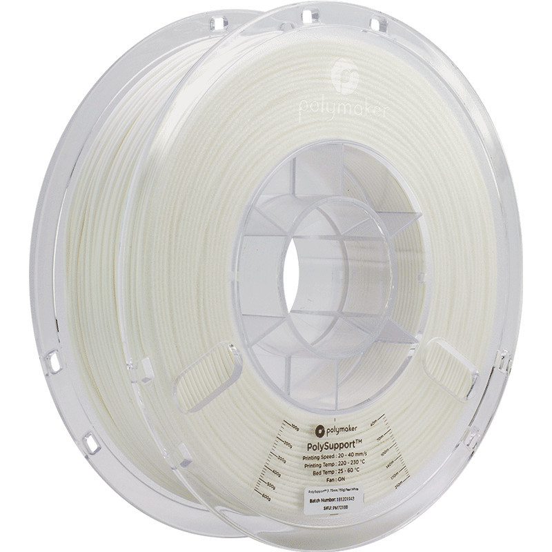 The PolySupport™ 3D filament from Polymaker is a material used as a complement to the main build material. This filament has the advantage of allowing support structures to be removed by hand and does not require any chemicals or water compared to PVA and/or BVOH.