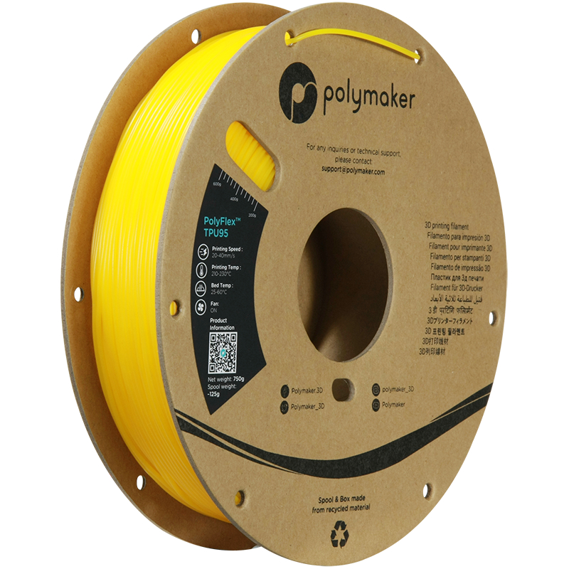 Polymaker Polyflex TPU-95A Yellow is a highly flexible filament. Polymaker Polyflex features great elasticity and excellent tensile strength for a variety of applications.