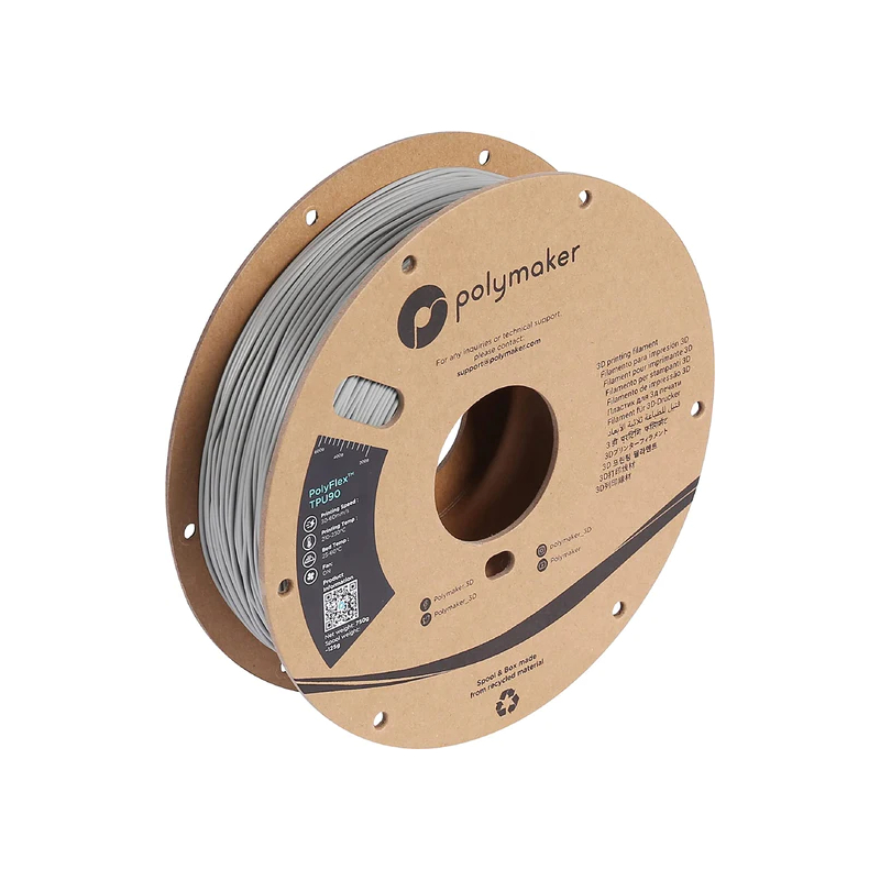 PolyFlex TPU90 Gray by Polymaker is a high-quality flexible filament offering shore 90A elasticity, UV resistance, and excellent tear strength. It is ideal for durable and flexible technical parts.