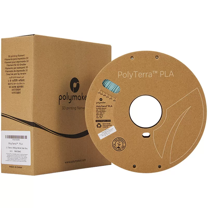 The eco-responsible PolyTerra Marbled Slate Grey PLA filament was developed by Polymaker using a technology called "Fully Bio Compound (FBC)", which combines PLA (a biodegradable polymer derived from corn, beet, and wheat starch) with organic minerals.