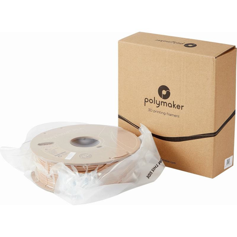 The eco-responsible PolyTerra Wood Brown PLA filament was developed by Polymaker using a technology called "Fully Bio Compound (FBC)", which combines PLA (a biodegradable polymer derived from corn, beet, and wheat starch) with organic minerals.