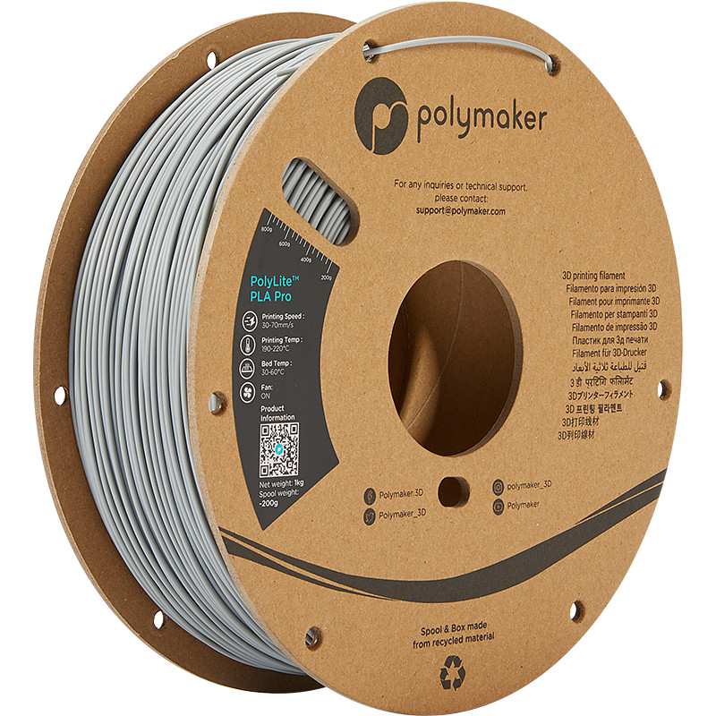 The PolyLite™ PLA Pro filament is a material that sits between two existing ranges of PLA from Polymaker. The PolyLite PLA Pro Grey provides high impact resistance while combining the excellent rigidity of PLA and other properties of standard PLA.