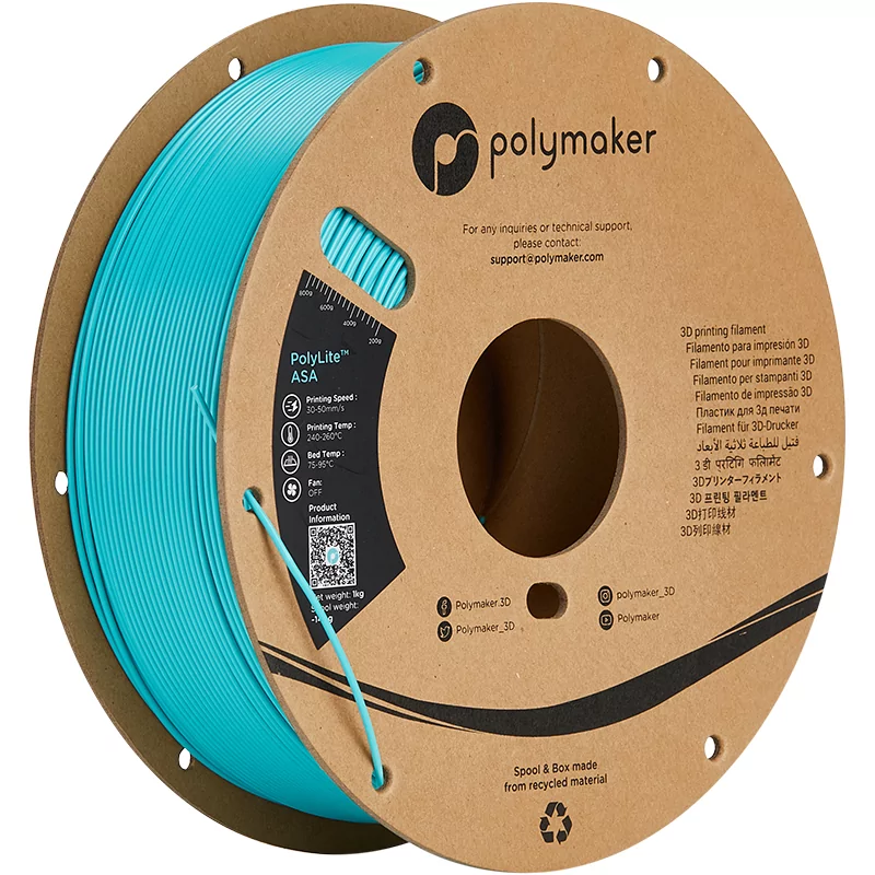 Polymaker Polylite ASA Polymaker Teal is a filament with excellent mechanical properties. UV resistant and capable of withstanding temperatures up to 105.3°C, it is ideal for outdoor applications.