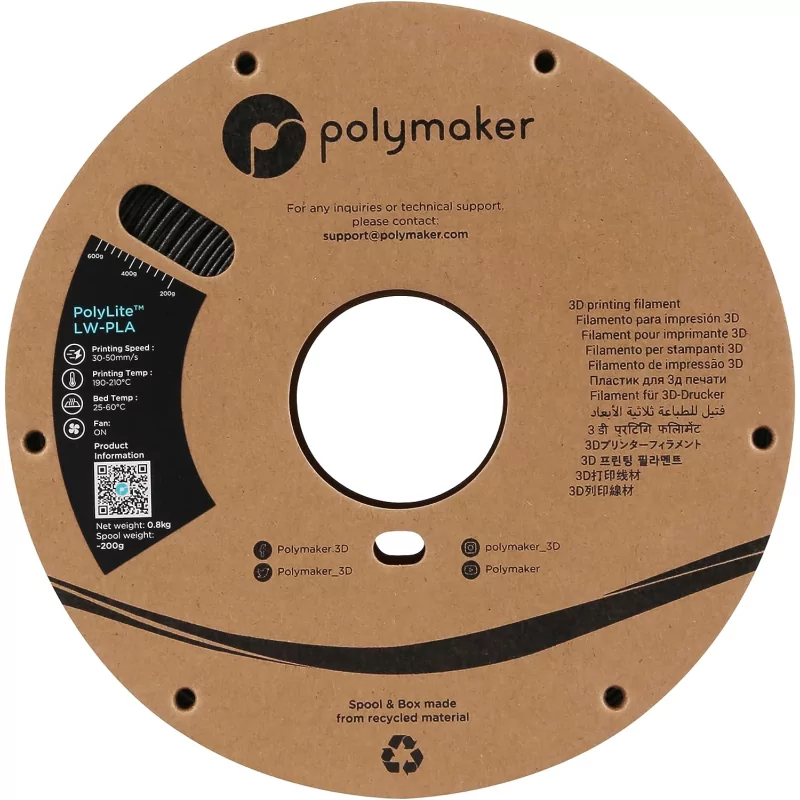 The PolyLite™ LW-PLA Black from Polymaker is a specially expanded PLA designed to be printed with similar settings to regular PLA but at half the weight and lower density.