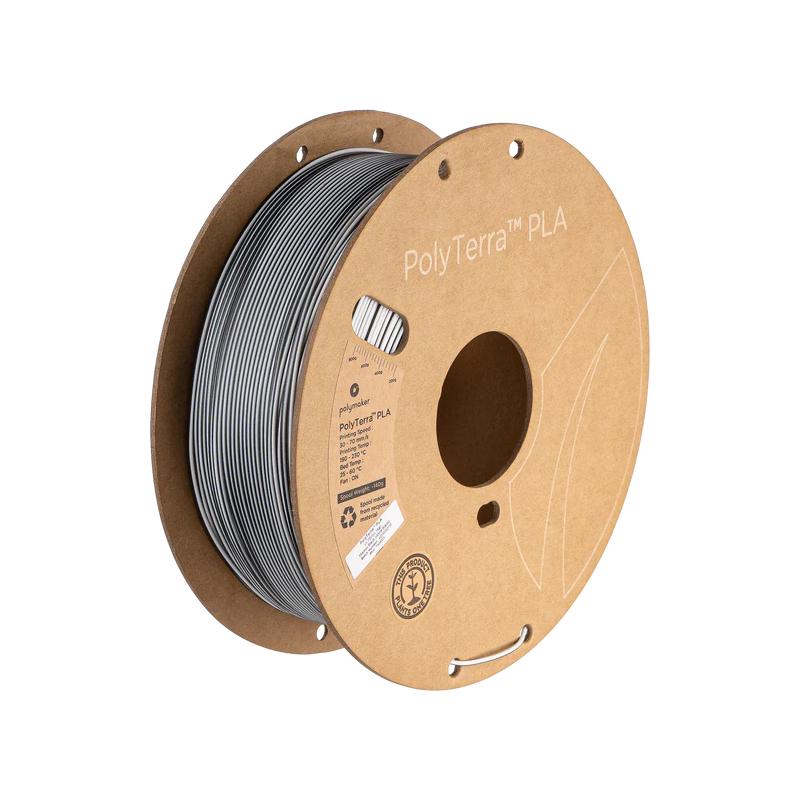 The eco-friendly PLA filament PolyTerra Black White was developed by Polymaker with a technique called "Fully Bio Compound (FBC)", which is a blend of PLA (a biodegradable polymer based on corn starch, beet, and wheat) and organic minerals.