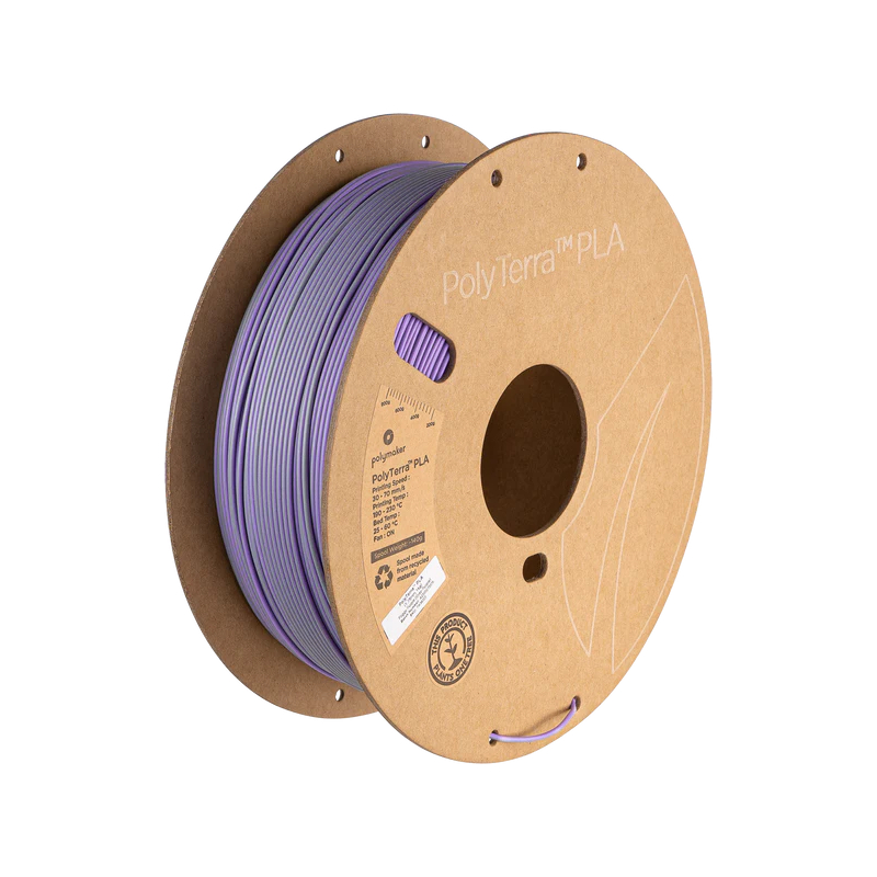 The PolyTerra PLA Dual Grey Purple (Foggy Purple) is an environmentally friendly recyclable filament made from organic materials and offers high printing quality.