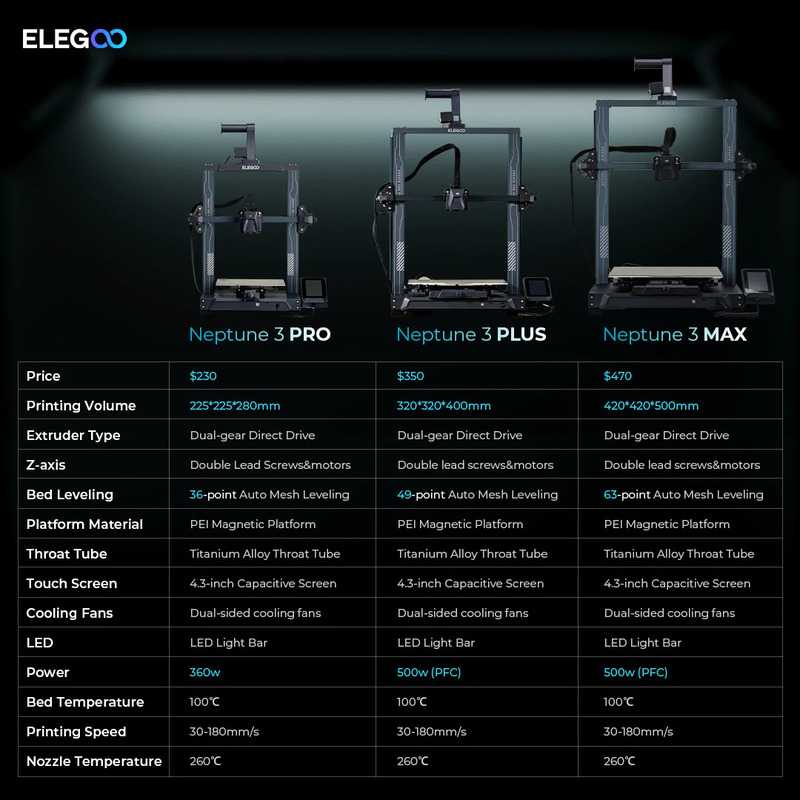 The main difference between the Elegoo Neptune 3 Pro and the Elegoo Neptune 3 Plus is the size of their print volume. The Elegoo Neptune 3 Plus has a print volume of 320 x 320 x 400 mm, which is slightly larger than that of the Elegoo Neptune 3 Pro, which has a print volume of 225 x 225 x 280 mm.
