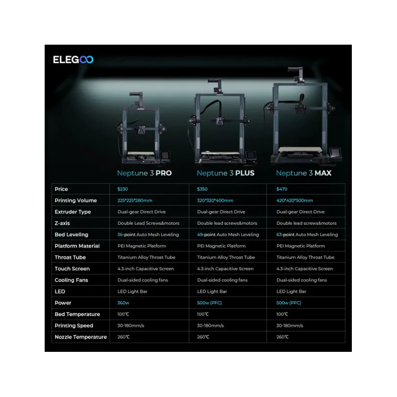 The main difference between the Elegoo Neptune 3 Plus and the Elegoo Neptune 3 Max is the size of their print volume. The Elegoo Neptune 3 Max has a print volume of 420 x 420 x 500 mm, which is slightly larger than that of the Elegoo Neptune 3 Pro, which has a print volume of 320 x 320 x 400 mm.