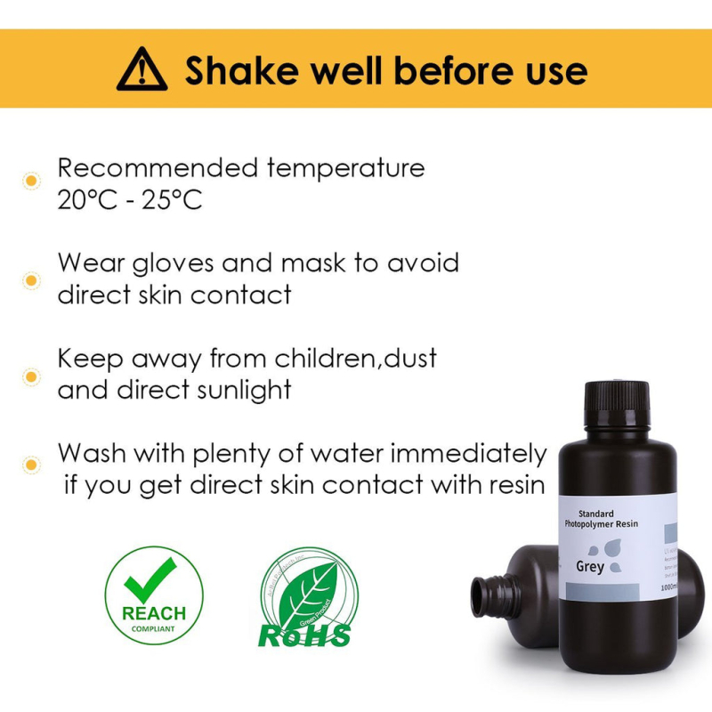 Unlimited applications: The Elegoo Standard resin can be used on most 405nm-sensitive DLP/LCD 3D printers. Its high quality and dimensional accuracy are very useful for printing precise parts, whether in the dental sector, design, visual prototyping, etc.