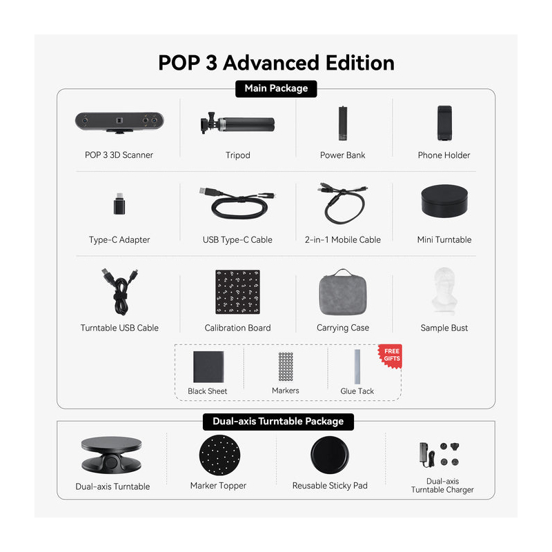 Que contient le POP 3 ? Le Revopoint POP 3 est livré avec un ensemble complet d'accessoires, dont un plateau tournant à deux axes, un câble d'alimentation, un adaptateur multirégional, un tampon adhésif réutilisable et une table amovible avec marqueurs, garantissant une expérience de numérisation 3D complète et pratique.