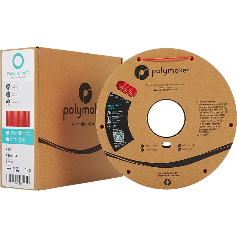 The Red ABS filament from the PolyLite series developed by Polymaker is a high-quality ABS filament containing a minimal amount of fine particles (VOCs) to limit harmful emissions.