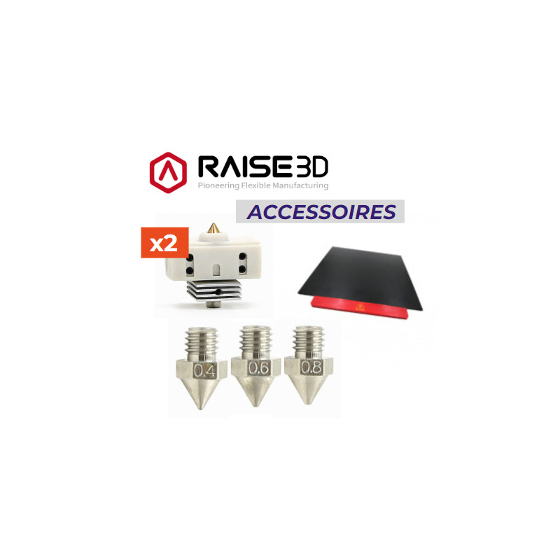 A pack of accessories to maintain and service your Raise3D Pro2 or Pro2 Plus printer. Two new hotends, a tray and a set of steel nozzles V3H to get your printer up and running again.