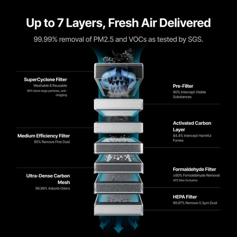 The xTool SafetyPro™ AP2 Max is an air purifier designed for laser engraving and cutting workshops. Fumes and particles are effectively captured thanks to a multi-stage filtration system.