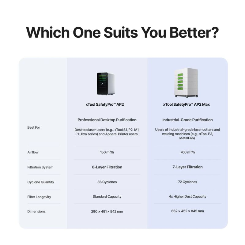The xTool SafetyPro™ AP2 Max is designed for environments using CO₂ lasers. It filters fumes and particles generated during engraving or cutting, providing a healthier and safer workshop.