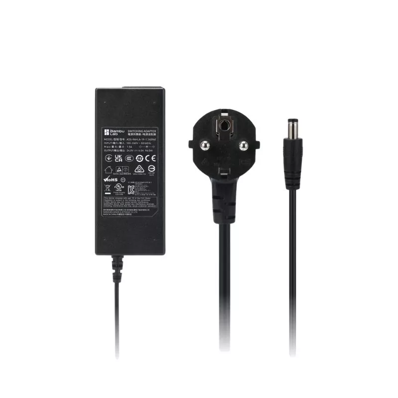 The AMS 2 Pro Power Adapter allows multiple AMS 2 Pro units to be powered simultaneously for filament drying. If a printer from the X1, P1, or A1 series is used with the AMS 2 Pro and its drying function, each AMS 2 Pro requires an official Bambu Lab Switching Adapter for power supply.
