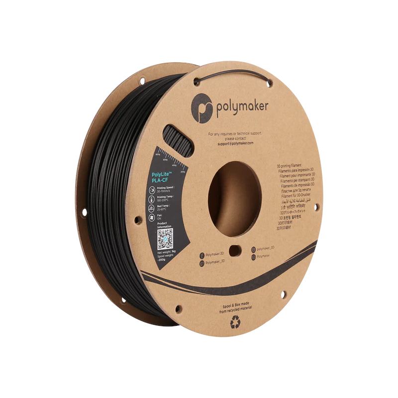 Easy to print: A high-quality carbon fiber PLA, PLA-CF features excellent dimensional accuracy and is manufactured with Polymaker’s Jam-Free™ technology for superior print quality. PolyLite™ PLA-CF works well on most print surfaces with a bed at 25°C - 60°C and a thin glue stick layer applied.