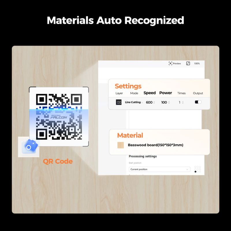 The Falcon A1 automatically detects materials via an integrated QR code system, optimizing engraving and cutting parameters without manual setup.