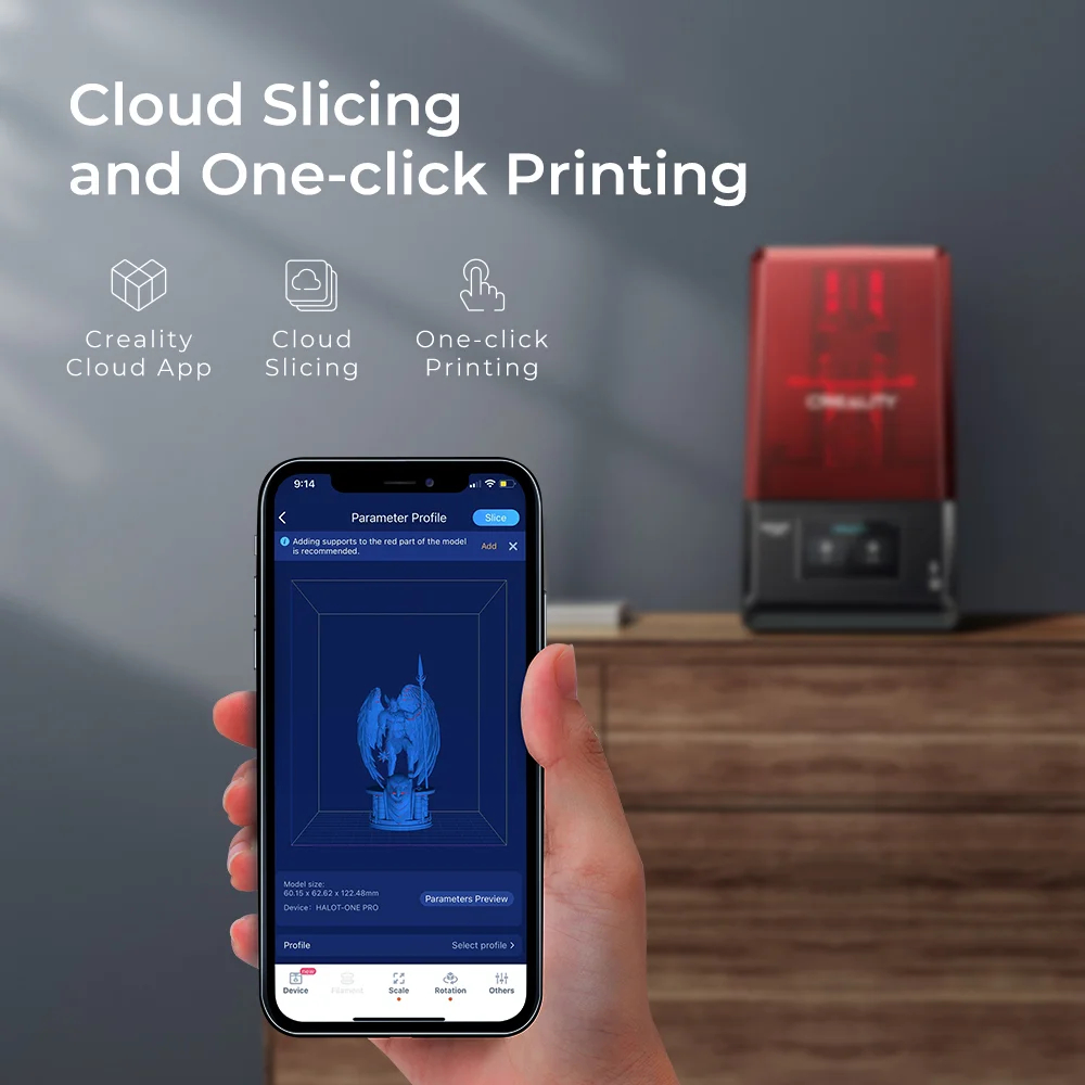 Thanks to the Wi-Fi connection, you can control and start printing remotely from your smartphone. The Creality Halot-One Pro will also automatically update your printer with just 1 click.