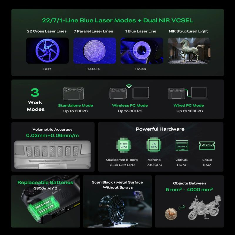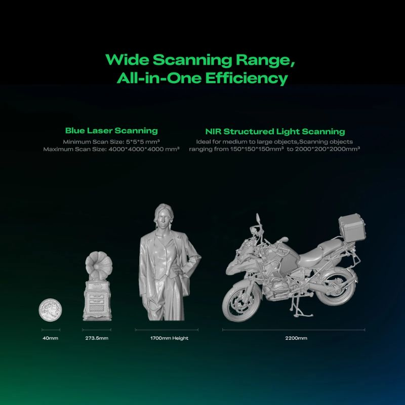 Combines blue laser and NIR light for efficient capture of both small and large objects.