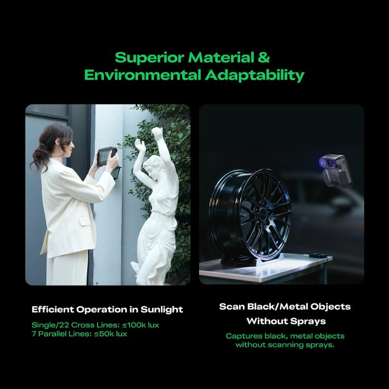 Enables fast, marker-free scanning of large objects and the human body (Class I laser).