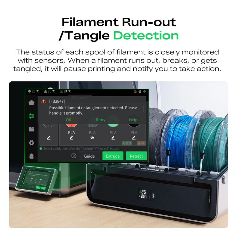 When a filament spool runs out, the system automatically switches to another spool of the same material and color. This allows multicolor printing to continue without interruption, ensuring perfect continuity for complex models.