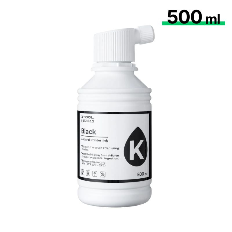 Black Ink 500 ml for the xTool Apparel Printer. Official xTool ink for bright, high-impact textile prints.