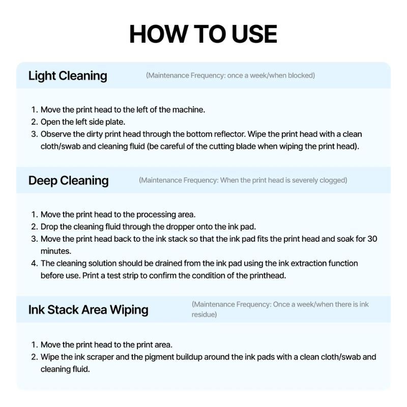 This cleaning liquid specially formulated for the xTool Apparel Printer effectively solves stubborn clogging problems caused by ink residues. It restores print quality by eliminating defects such as color shifts, visible lines, or inability to print certain colors.