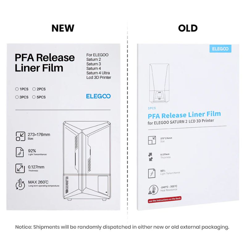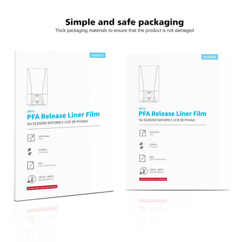 Specifications for Pack of 5 PFA films (FEP 2.0) Elegoo Saturn 4 series, Saturn 3, Saturn 2, Saturn 8K