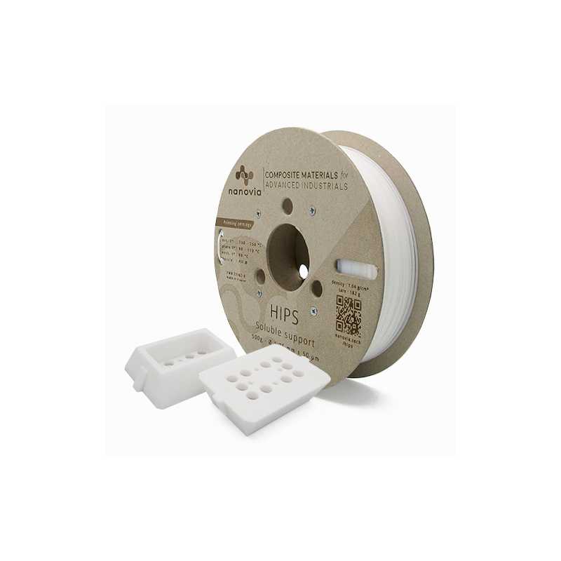 Nanovia HIPS is perfectly suited to printing supports and rafts in double extrusion 3D printing. It is compatible with the vast majority of materials and provides a rigid foundation that is easy to remove from your parts. It is soluble in limonene.