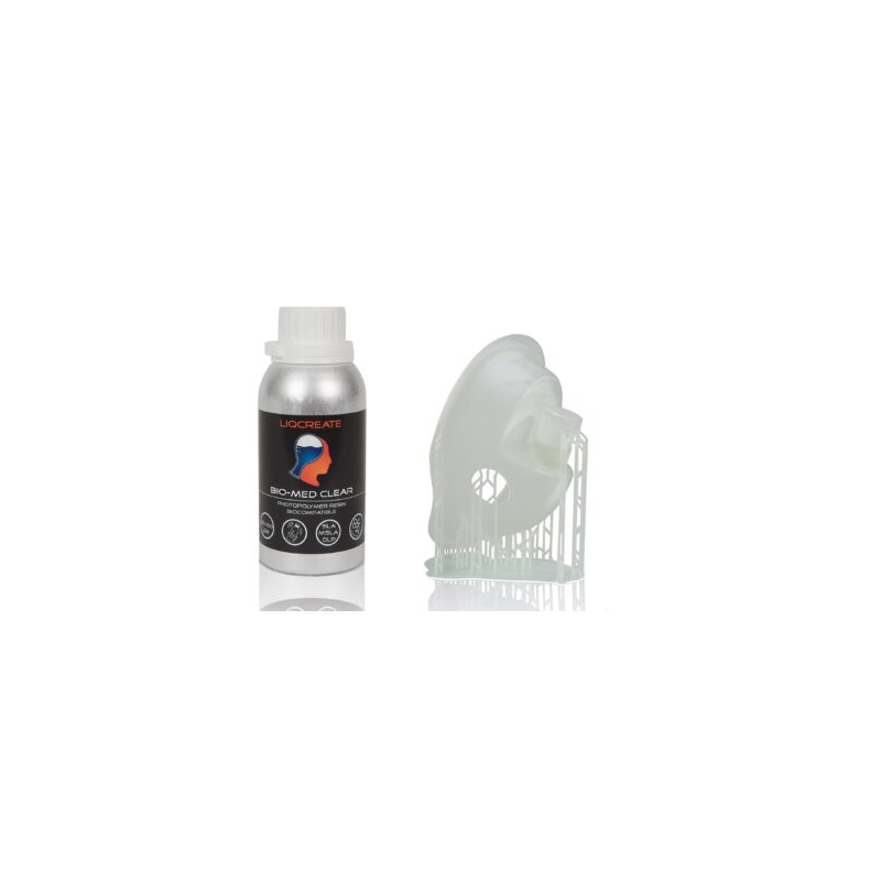 Liqcreate Bio-Med Clear is a rigid and transparent biocompatible photopolymer resin that can be processed on most resin based 3D printers.