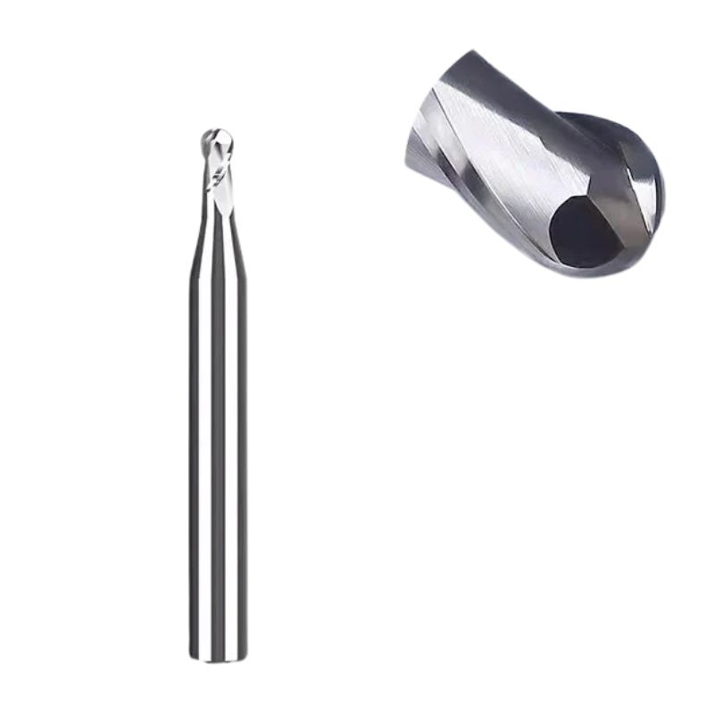 The 2.5mm x 7.5mm Two-Flute Ball Nose Bit Makera Carvera is a tool designed for 3D surface machining, curved contours, and complex geometries on metal parts. Its two-flute design facilitates chip evacuation while maintaining good surface finish.