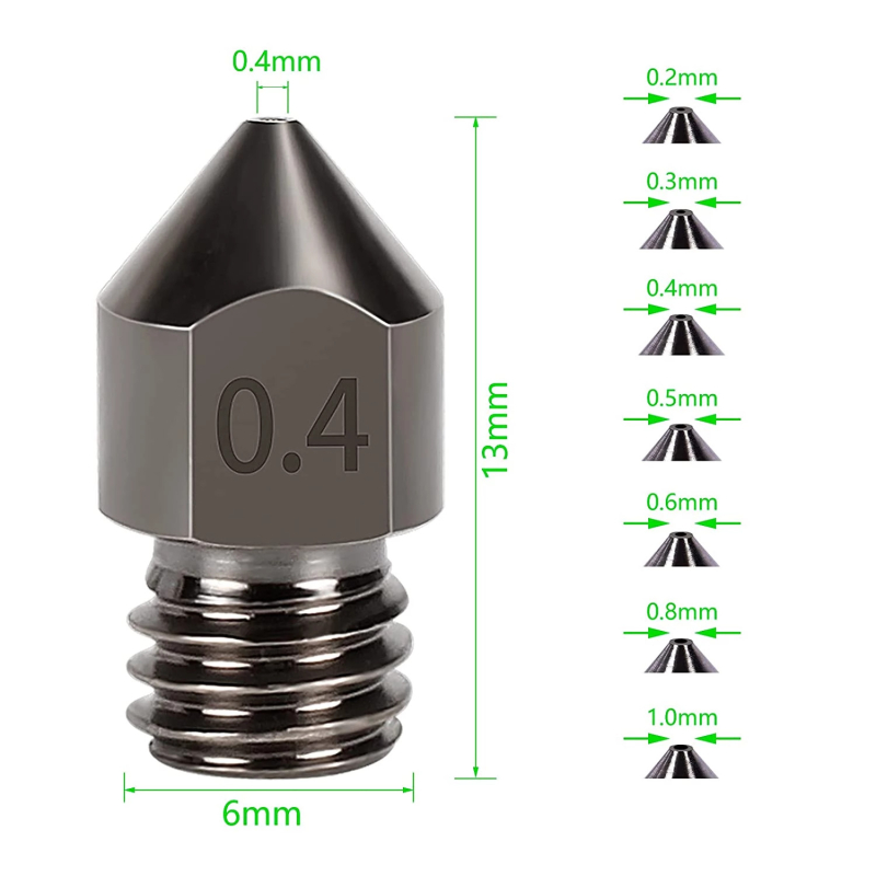 These 0.8mm hardened steel nozzles are designed for many FDM 3D printers and can be used on hotends with an M8/MK8 thread.