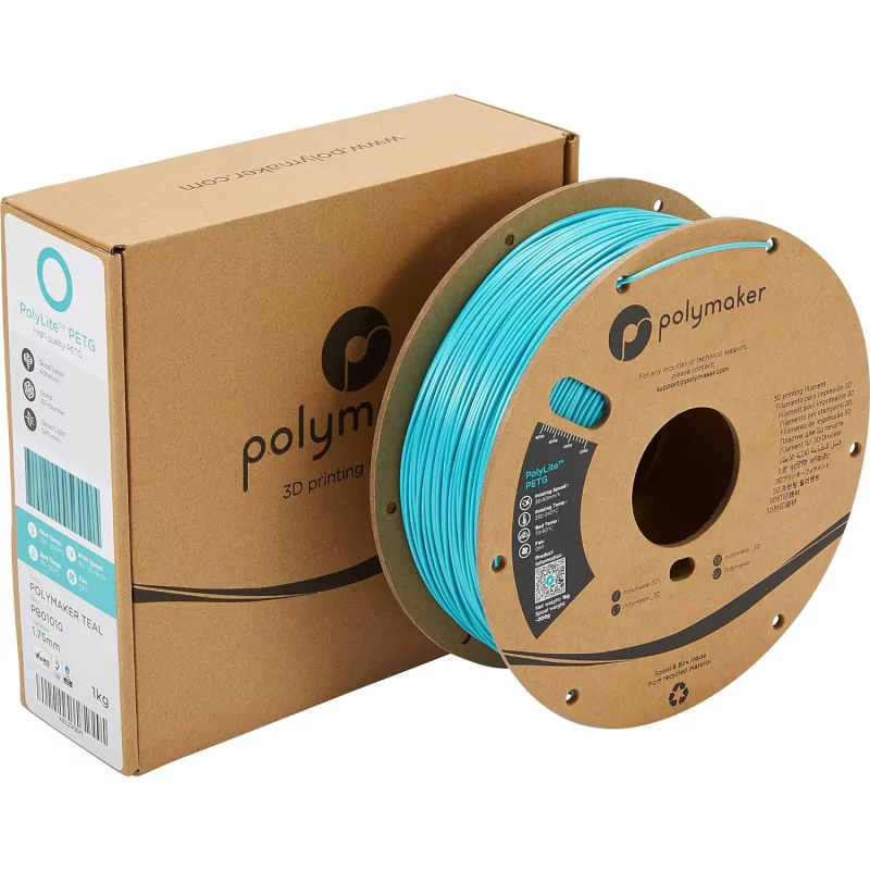 Polymaker’s PolyLite PETG Teal is a high-quality filament, more resistant and flexible than PLA, with better heat tolerance (81°C).