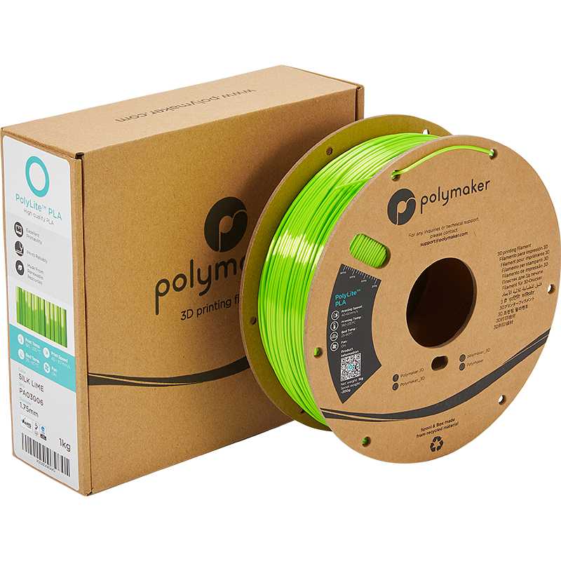 The PolyLite PLA Silk Lime filament is a type of PLA that offers a glossy Silk finish.