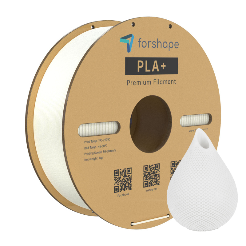 The PLA+ White Forshape Premium 1.75mm filament is a high-quality Premium PLA, supplied on a 1 kg cardboard spool.
