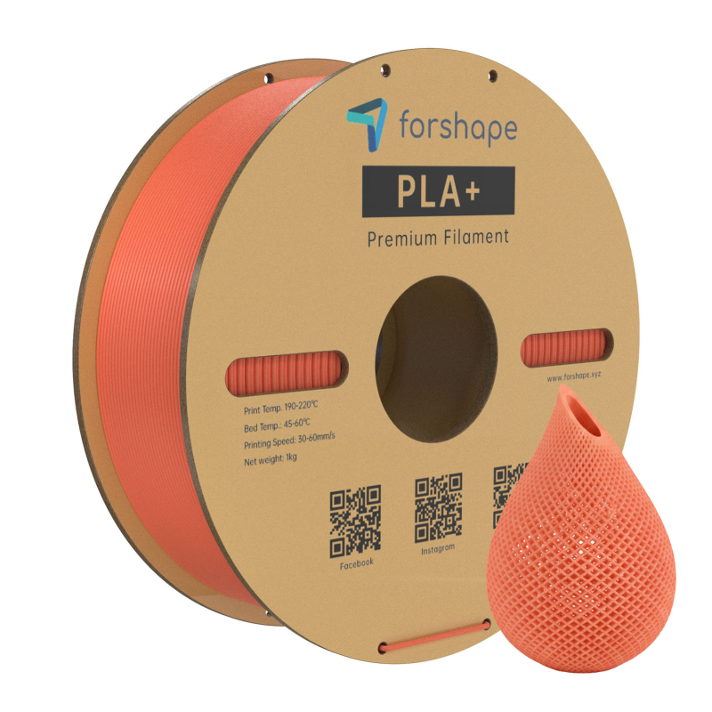 It meets strict standards such as ROHS and REACH and offers exceptional ease of use. PLA+ Orange Forshape is slightly modified to be more rigid and wear-resistant than standard PLA filaments. Its chemical properties also make it less brittle.