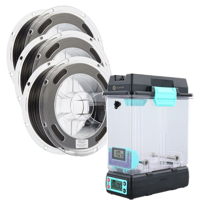 This Polymaker bundle combines 3 spools of PolyMide PA12-CF Black and 1 PolyDryer Polymaker for very high-performance technical 3D printing. PolyMide PA12-CF is a nylon 12 filament reinforced with carbon fiber, offering excellent mechanical and thermal properties while maintaining strong layer adhesion.