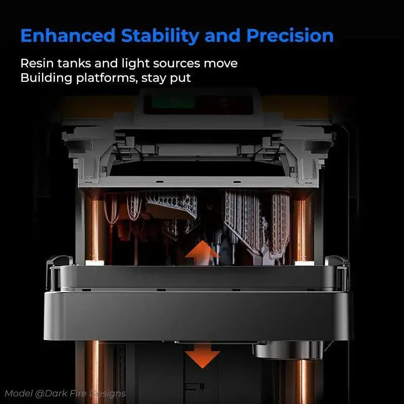 A fixed linear motion structure combined with a moving light source reduces vibrations, ensuring more stable and higher-quality prints.
