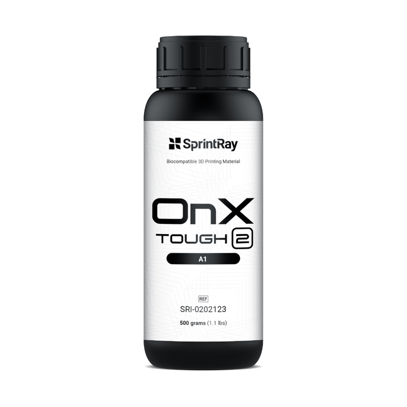 The SprintRay OnX Tough 2 - A1 - 500g is a next-generation dental resin designed for the manufacture of fixed hybrid prostheses. Thanks to the exclusive NanoFusion™ technology, it combines high mechanical strength with a natural aesthetic appearance, comparable to enamel.