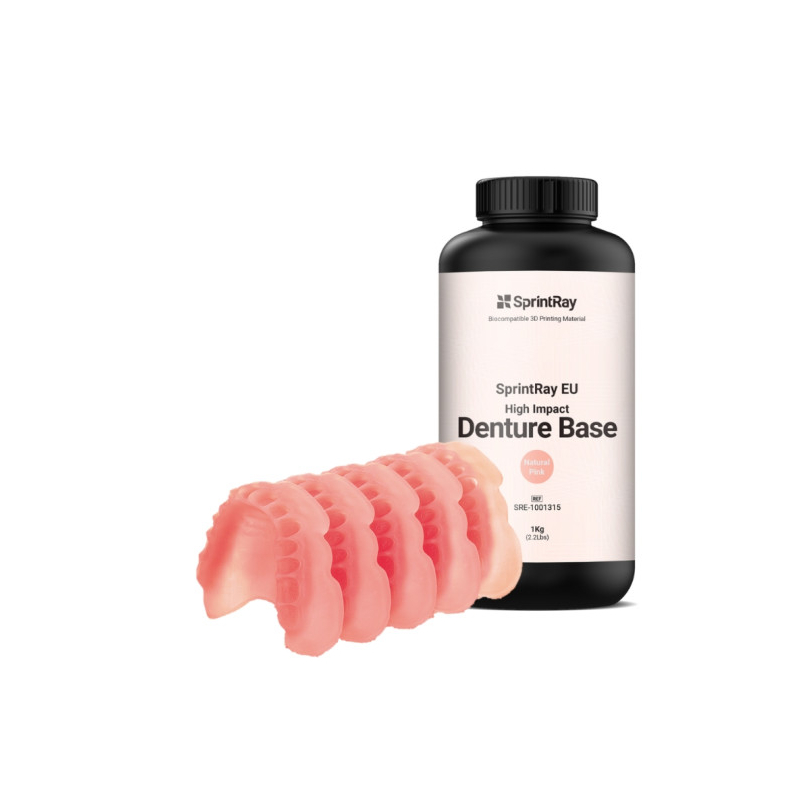 The resin SprintRay High Impact Denture Base - Shade Deep Pink - 1kg is specially designed for the manufacture of resistant and comfortable prosthetic bases. Its biocompatible formulation ensures optimal safety in the mouth, while its advanced mechanical properties offer a flexural strength of 65 MPa and a flexural modulus of 2000 MPa.