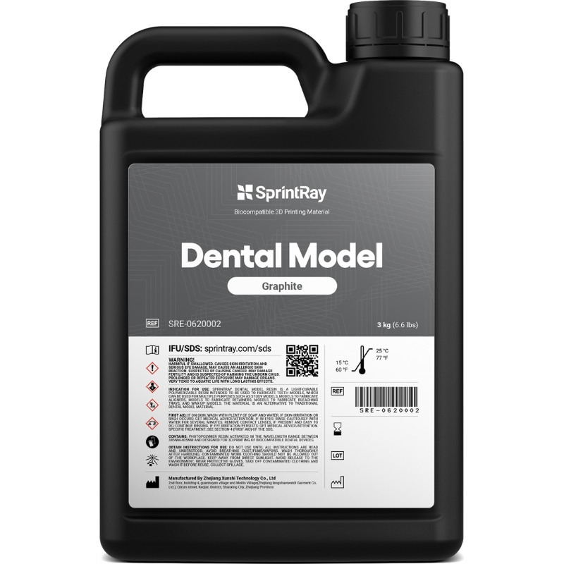 The SprintRay Dental Model Graphite Resin - 3 L is formulated to deliver exceptional dimensional accuracy and an opaque matte surface that eases detail inspection. Ideal for producing dental models and aligners, it stands out for its faithful reproduction and perfect compatibility with SprintRay printers.