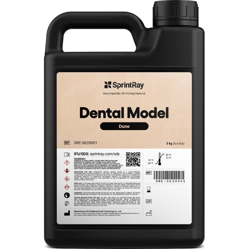 The SprintRay Dental Model Dune Resin - 3 L is formulated to deliver exceptional dimensional accuracy and an opaque matte surface that eases detail inspection. Ideal for producing dental models and aligners, it stands out for its faithful reproduction and perfect compatibility with SprintRay printers.