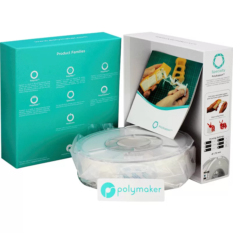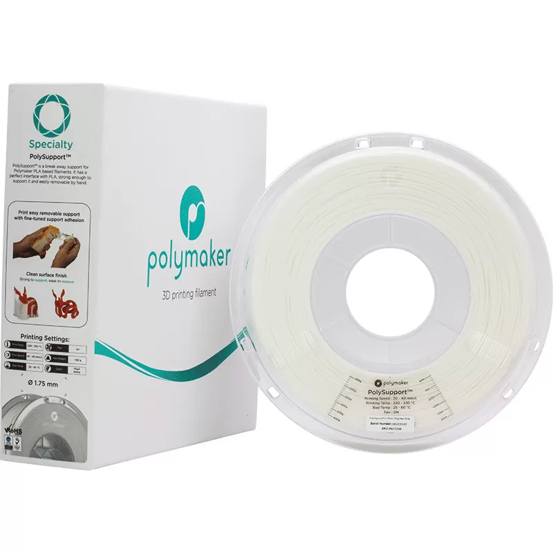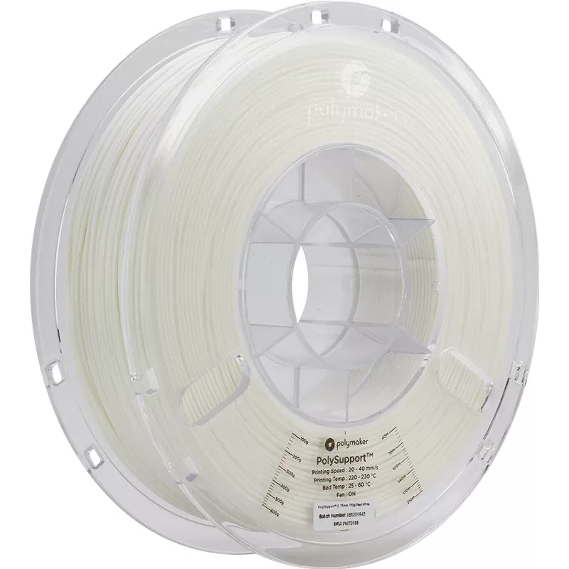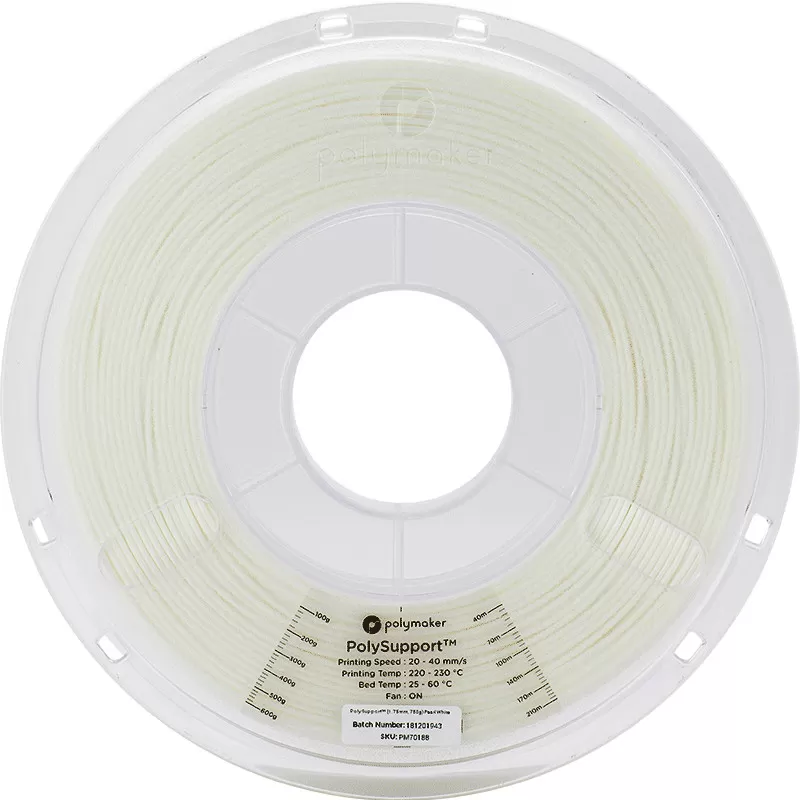 The PolySupport™ 3D filament from Polymaker is a material used as a complement to the main build material. This filament has the advantage of allowing support structures to be removed by hand and does not require any chemicals or water compared to PVA and/or BVOH.