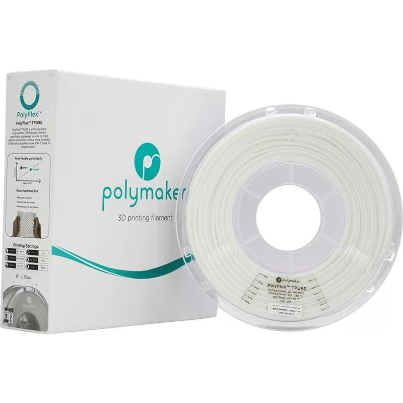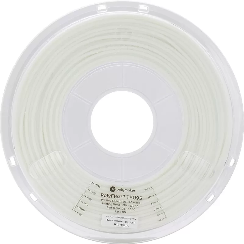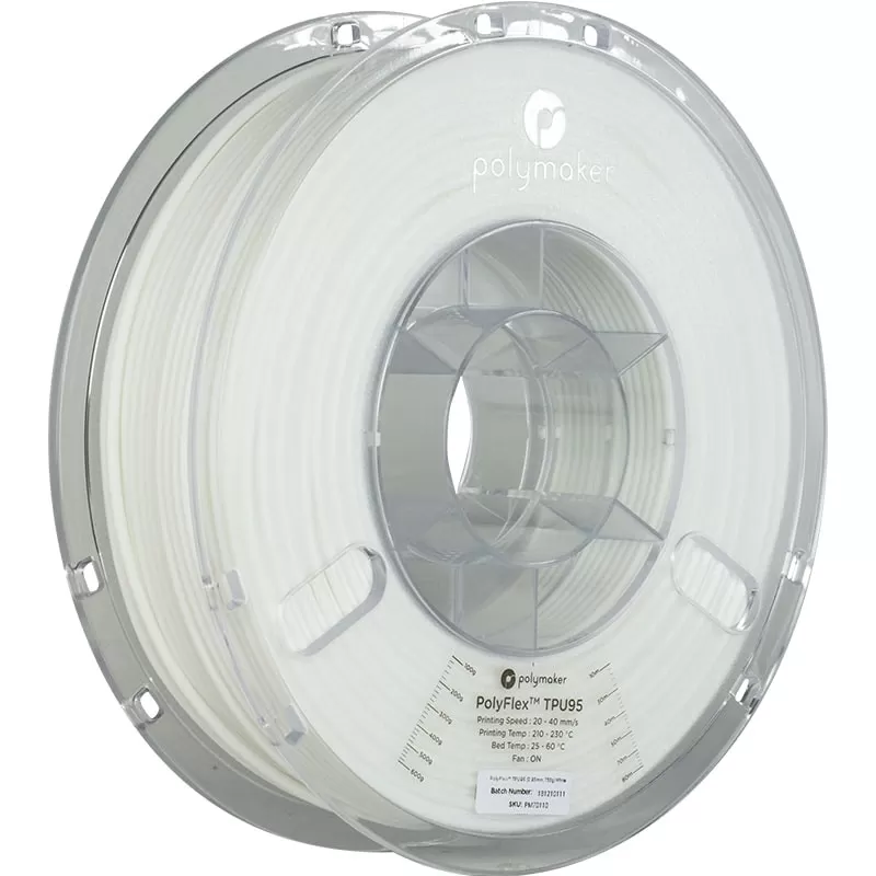 Le Polyflex TPU95 Blanc de Polymaker est un filament très flexible. Le Polyflex de Polymaker est doté d'une grande élasticité ainsi qu'une excellente résistance à la rupture pour des diverses applications.
