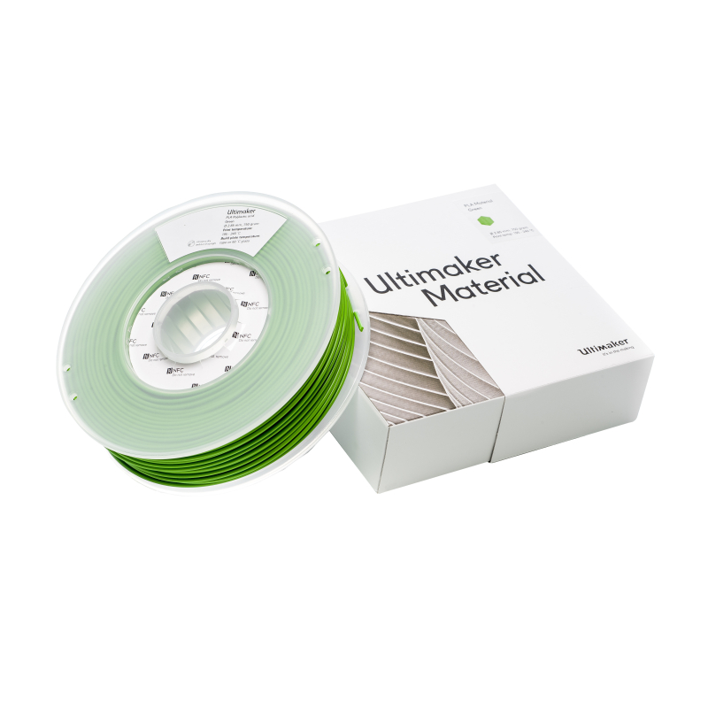 The Ultimaker PLA Green is versatile, easy to print, and available in 11 colors. It prints reliably, with good dimensional accuracy and a high-quality surface finish. These properties make it an ideal material for a wide range of applications, from detailed prototypes to simple jigs or decorative objects.